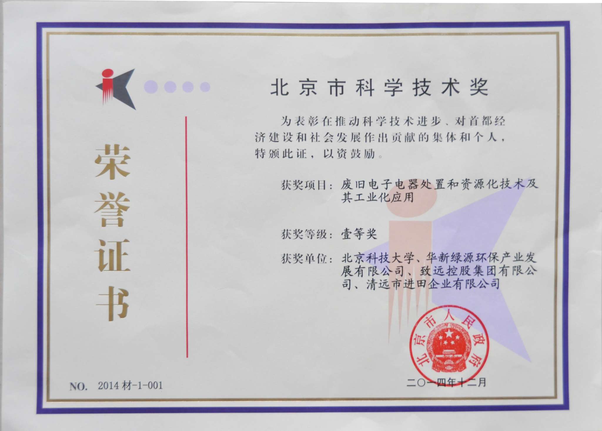 作為項目組成員,華新綠源環(huán)保產(chǎn)業(yè)發(fā)展有限公司研發(fā)的“廢舊電子電器處置和資源化技術(shù)及其工業(yè)化應(yīng)用項目”榮獲北京市科學(xué)技術(shù)一等獎。