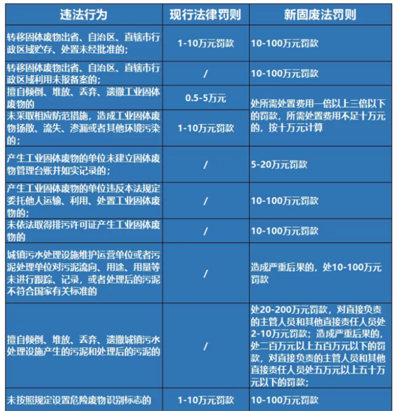 新固廢法普遍提高了對違法行為的罰款金額幅度,具體見下表: